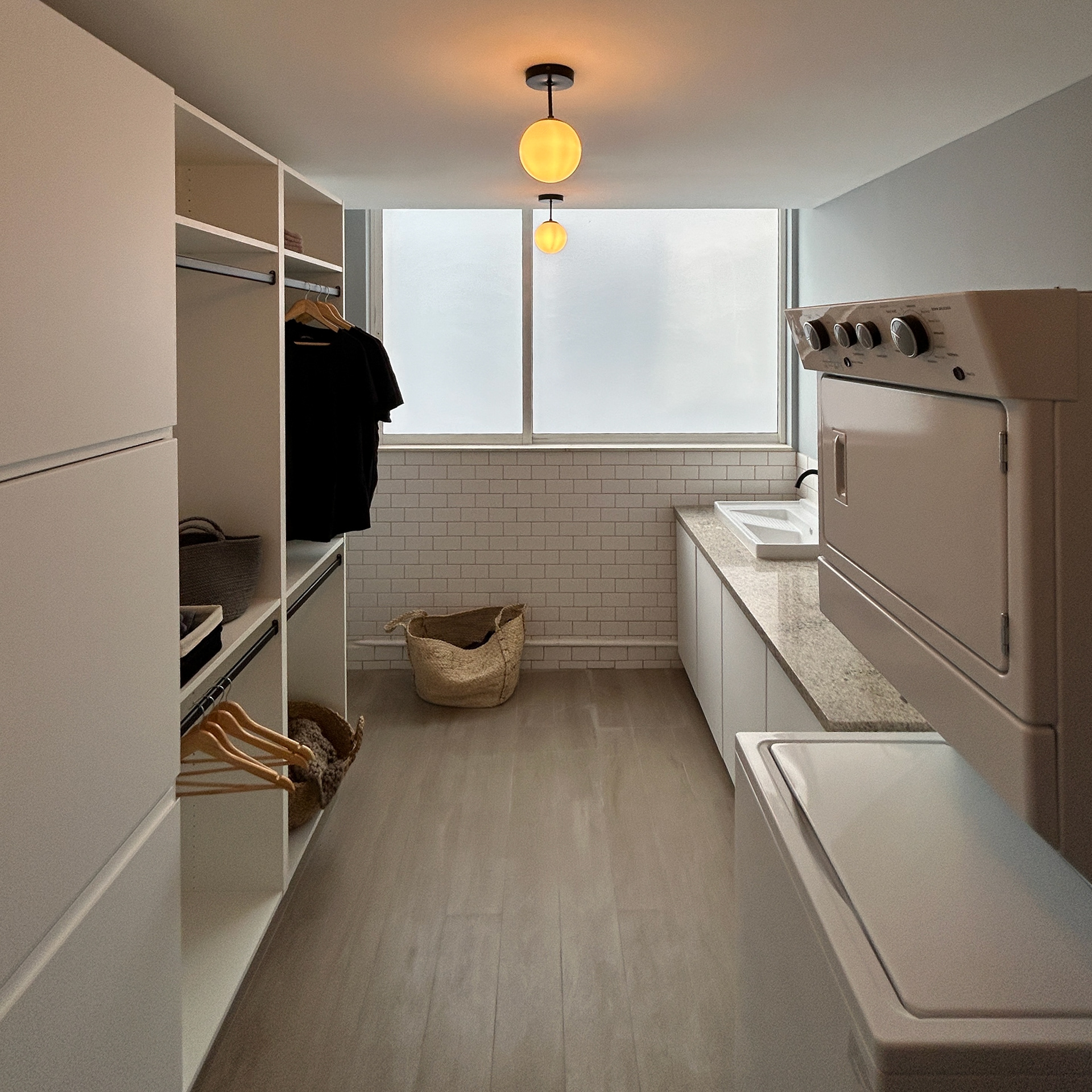Este proyecto transforma una lavandería tradicional en un espacio altamente eficiente, pensado para maximizar cada metro cuadrado mediante soluciones de almacenamiento, circulación fluida y equipamiento inteligente. El diseño se basa en una paleta neutra y materiales durables que aportan claridad visual, orden y armonía. Integramos módulos abiertos y cerrados para organizar ropa sucia, productos de limpieza y prendas en proceso, permitiendo una operación más ágil y limpia. La barra corrida con cubierta de granito entrega una superficie de trabajo amplia para doblado, clasificación y tareas de mantenimiento del hogar. El área de lavado y secado se optimizó para un flujo de trabajo práctico y ergonómico, complementada con iluminación cálida y uniforme que mejora la experiencia diaria. Cada elemento —desde la ventilación natural hasta los accesos, alturas de repisas y barras de colgado— fue diseñado para convertir este espacio en una estación doméstica eficiente, ordenada y estéticamente pulida, elevando la funcionalidad de la vivienda sin perder el lenguaje contemporáneo de DAMM Arquitectura.