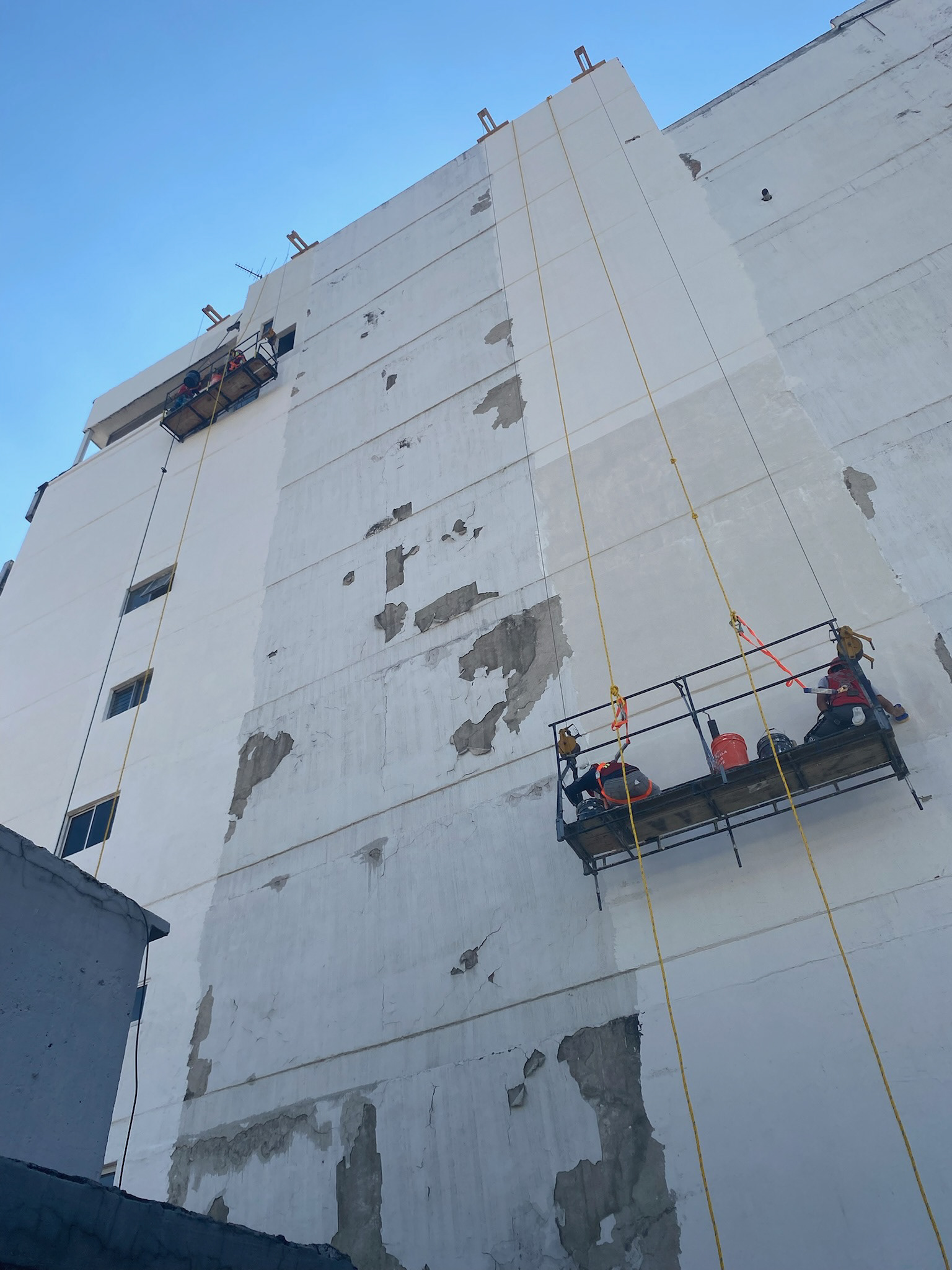 La intervención consistió en el retiro de pintura y material deteriorado, la preparación de superficies, la aplicación de nuevo aplanado con estuco y la pintura final para proteger y uniformar las fachadas. Los trabajos se ejecutaron mediante columpios de trabajo en altura y contemplaron también la gestión de los permisos correspondientes ante las autoridades.