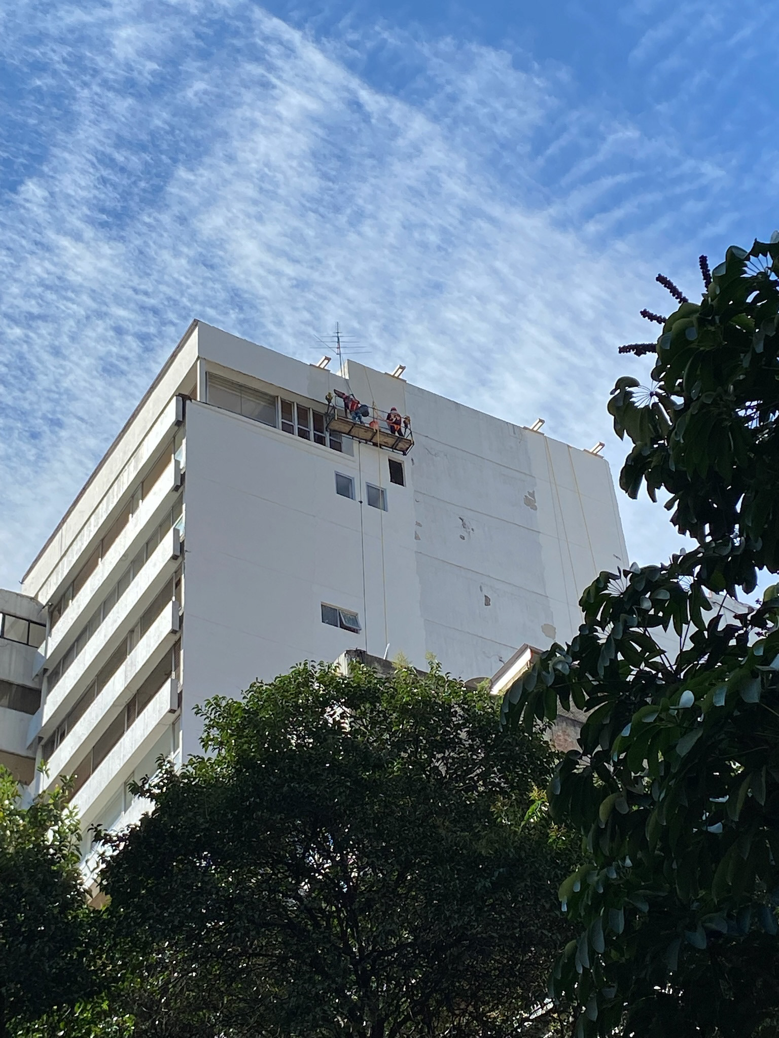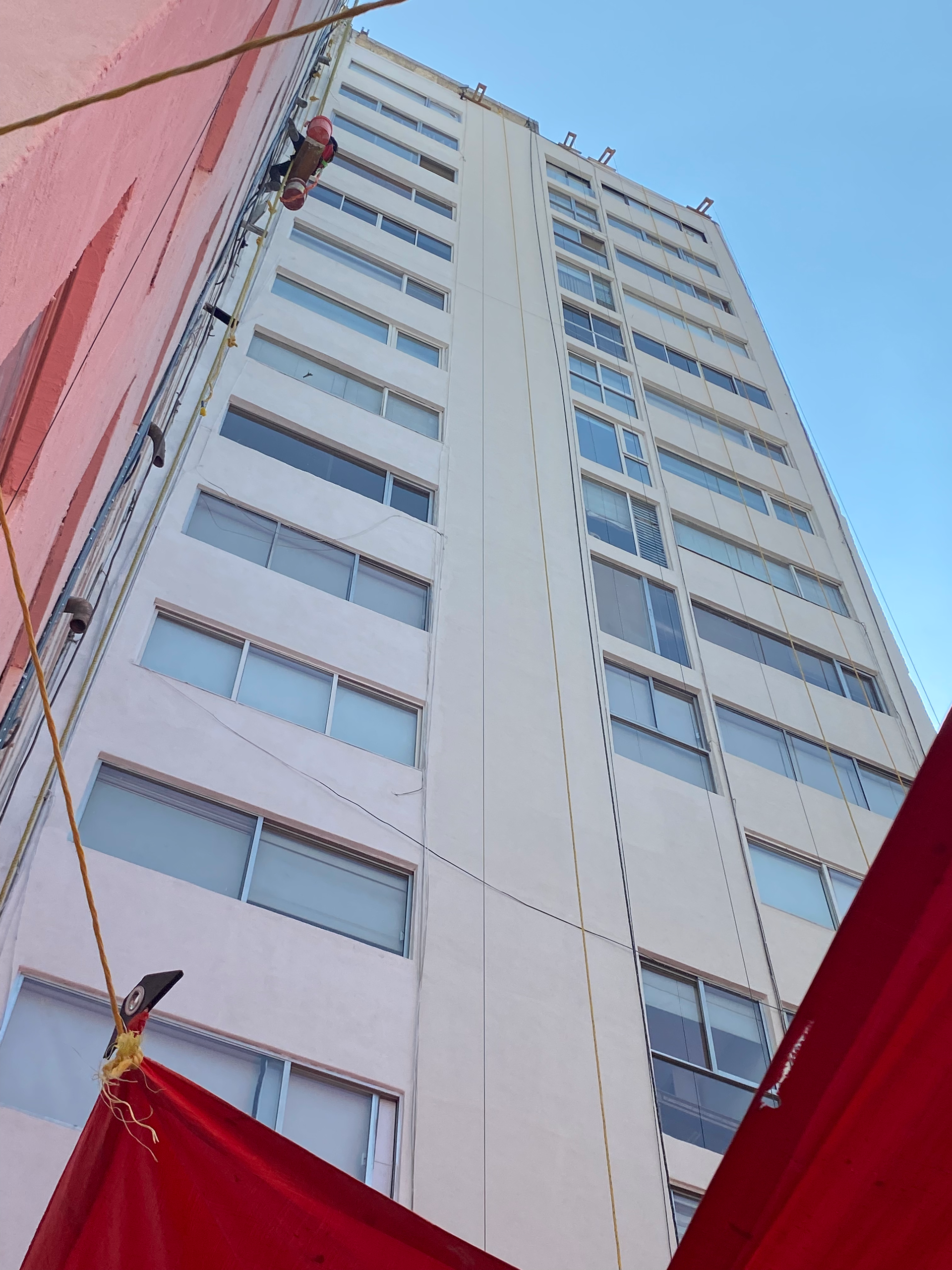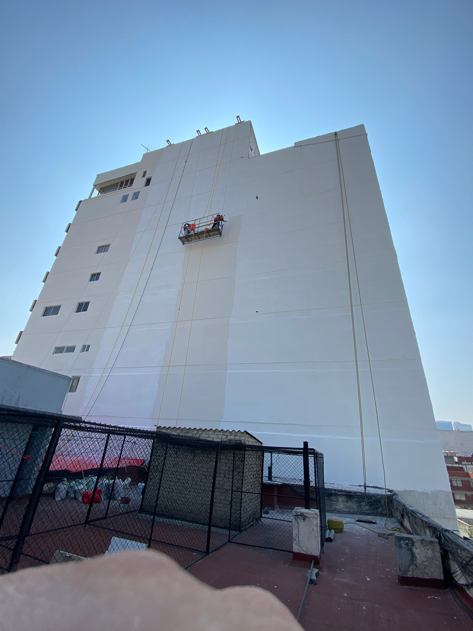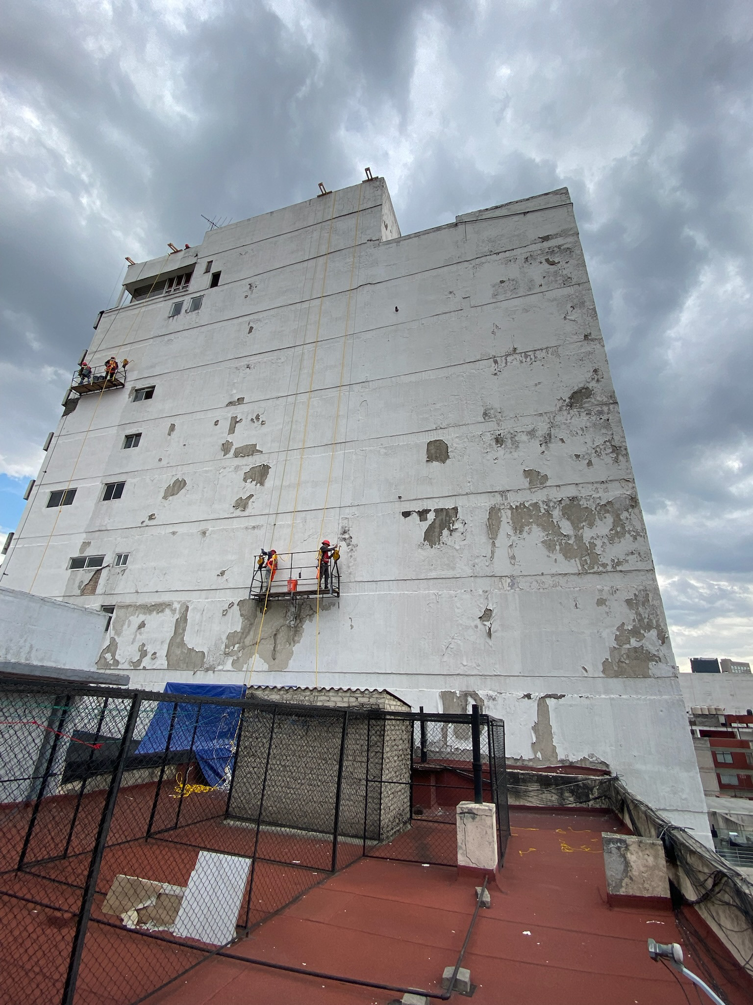 Intervención de rehabilitación en un edificio residencial de 16 niveles en la colonia Polanco, Ciudad de México. Los trabajos se realizaron en dos fachadas del edificio: la orientada al sur, que presentaba problemas de humedad y desprendimiento del aplanado, y la fachada posterior.